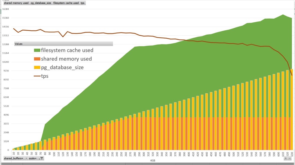 所有操作都在shared_buffers=4GB的情况下运行的。橙色和绿色区域的值是pgbench运行后从free -wm中获取的值的大小增长情况(以MB为单位)。当scale小于70时,pg_bench数据库的大小是1054MB(黄色),我没有看到额外分配的SHM(橙色),文件系统“缓存”(绿色)随着从文件中读取的大小而增加。然后,当scale增加到270时,SHM开始分配内存以适应shared_buffers(橙色)中的这些页面。“cache”(绿色)包括SHM和文件系统的缓存。超过280,SHM不会再变高了,因为我们达到了shared_buffer设置的大小4GB。在操作系统级别仍然有空闲内存,然后“cache”会随着读取数据的大小而增加。我还添加了性能指标“tps”——每秒的事务量。在shared_buffers的范围内运行这个select-only的工作负载会显示出稳定的性能(在单线程中约为13500 tps)。当需要从文件系统缓存中拷贝出一些页面时,性能会缓慢降低。当到达超出物理RAM容量的范围时,就会涉及到物理读,tps就会降低很多。这里有14GB的RAM,当scale达到了570,除了4GB的shared_buffers外,还有8GB用于频繁读取数据。
