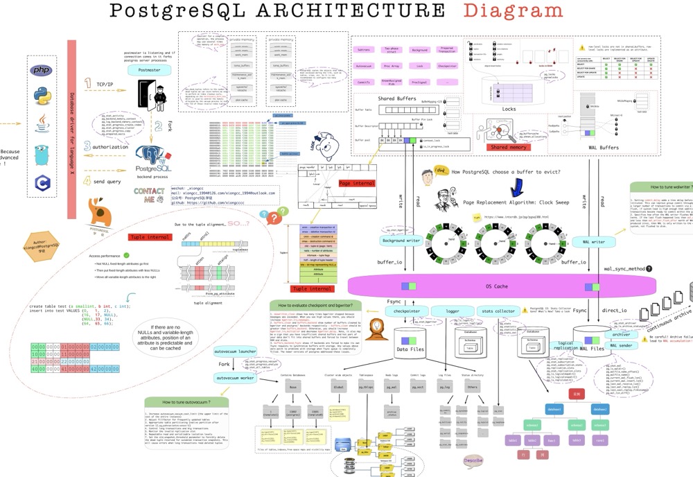 其次是PostgreSQL Architecture大图,已经和各位见面了,一张图展现PostgreSQL的体系架构,反响也很不错,已经捐给了社区,后续可能会在官方weekly里面看到,各位可以后台回复关键字获取链接。