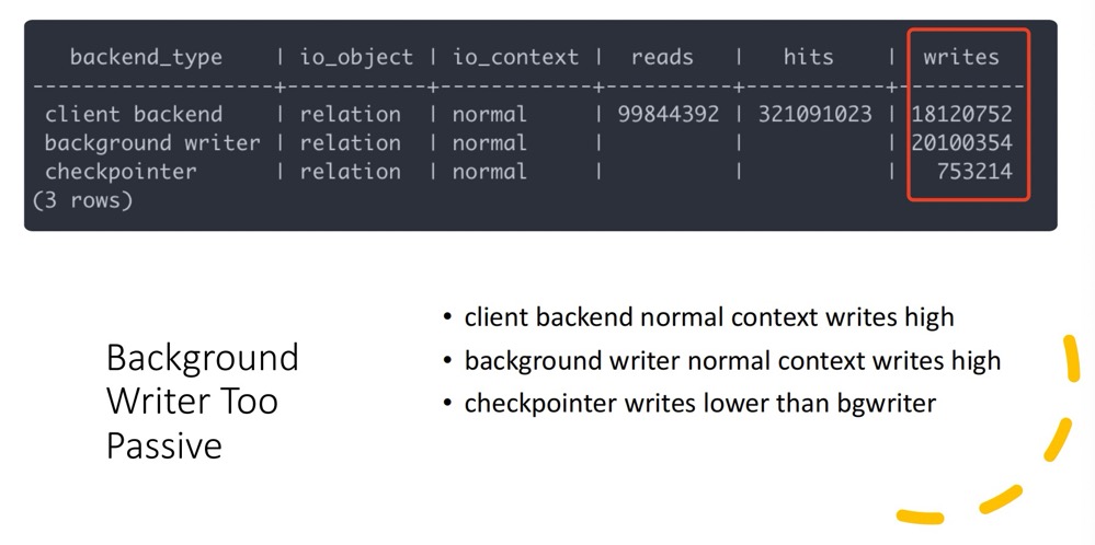 让我们看几个实际例子:数据块刷脏,我们知道 bgwriter 应该是写入主力,但是下面的数据却显示了 bgwriter 太过于懒惰,后端进程参与了很多写入操作,这会大大增加后端进程的延迟,因此我们需要去调整 bgwriter 相关的参数。