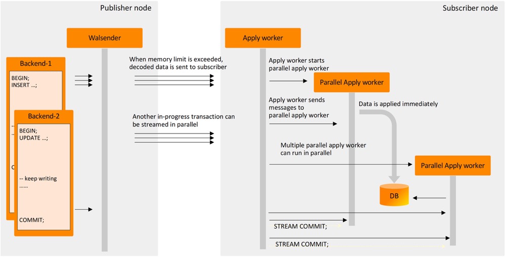 逻辑解码也有很多亮眼特性。首先是并行回放,对于”流式”事务 (流式 decoding 和发送,无需等待事务结束) ,订阅端无需等待发布端事务提交,并且可以创建多个 apply worker 并行回放 (每个事务一个 apply worker),进一步提升事务的处理能力,据测试显式,大约有 25% ~ 40% 的性能提升,不过具体效果会怎么样,还需要经过时间的验证,早期版本的并行也会有各种各样的 BUG,举个栗子,当 leader apply worker 和 apply worker 回放过程中遇到死锁冲突能否妥善处理。