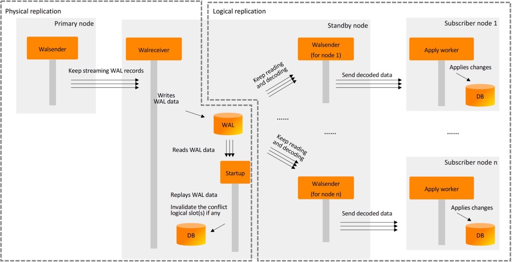 备库支持逻辑解码也是一项较大的提升,以减轻主库的压力。要求主库和备库都设置为 logical,当然这就会涉及到类似流复制冲突了,我们可以查看 pg_replication_slots.conflicting 字段,比如需要的字段在主库上被删了,或者主库将 wal_level 设为了小于 logical 的等级,这个时候备库的复制槽会变成 invalide 的状态。
