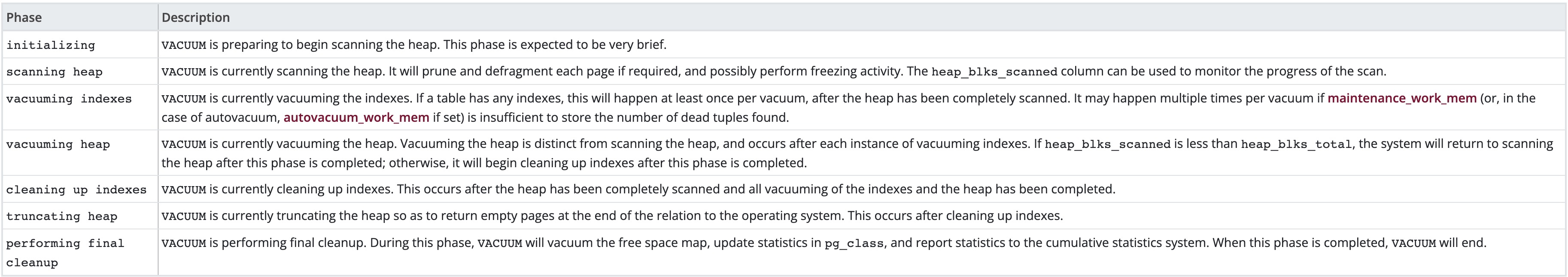 initializing → scanning heap → vacuuming indexes → vacuuming heap → cleaning up indexes → truncating heap → performing final cleanup