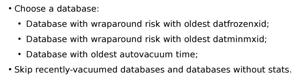 这里要提的是第一点,待清理的列表,可能有的同学会问了,假如有很多个库中的表达到了阈值,PostgreSQL是如何选择要清理的数据库的?其实有一套复杂的”打分”机制,autovacuum launcher每隔autovacuum_naptime去判断一下哪些库要进行清理,autovacuum launcher两次启动autovacuum worker的时间间隔不会大于autovacuum_naptime