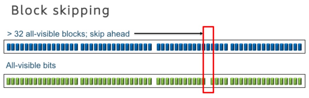 顾名思义,跳过某些数据块,vacuum会跳过all-visible的数据块,也确实应该如此,如果每次都从头全部扫描一遍,即使数据块中不包含死元祖也扫描无疑太过于stupid,这会增加很多无用功。