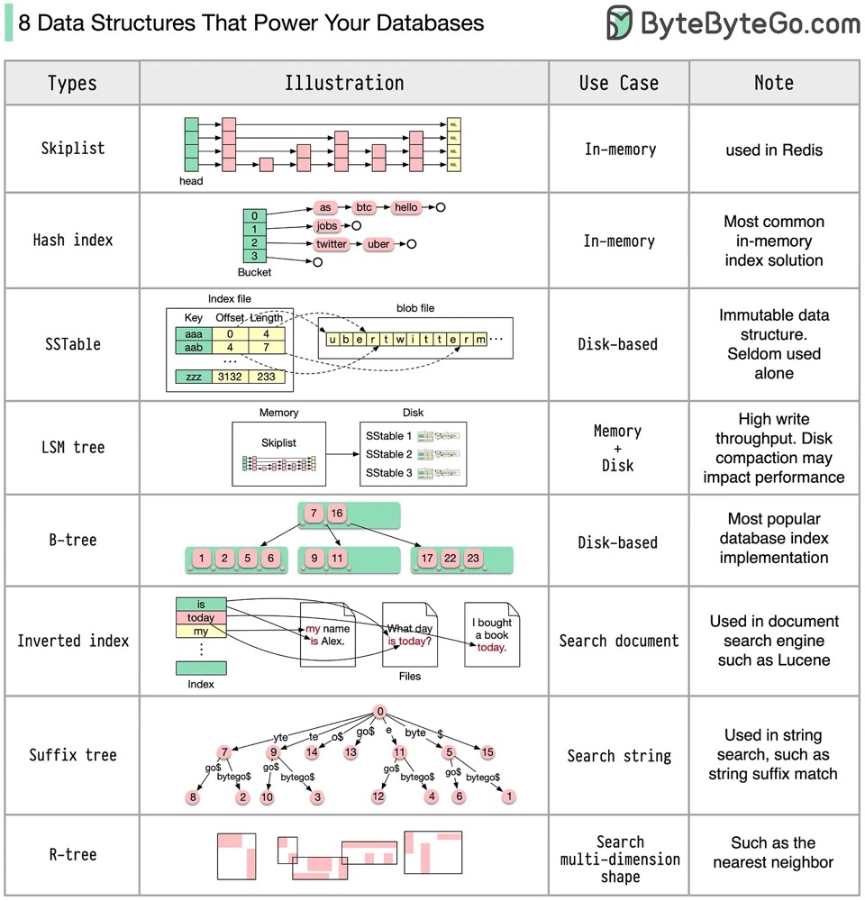 其次是索引,在AP领域,由于数据量庞大,百亿数据很常见,建个索引是十分吃力的,并且有时返回的数据量也很大,动辄几十个字段group by,这个时候索引可能就派不上用场,目前我看Greenplum还没有”虚拟索引”的概念,因此在评估是否需要创建索引时,一定要衡量好索引的选择率,以及对资源的取舍,不然建几个小时结果还是个garbage那就亏大了,Greenplum更加注重多个节点协同并行计算。另外还支持Bitmap索引,适用于那种字段重复值较高的场景。我十分喜欢bytebytego的这种图: