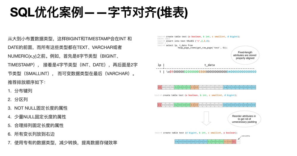 其次是字节对齐,这个和PostgreSQL堆表是类似的,我在SQL优化文章中也提及过,合理地排列列的顺序可以提升性能、降低存储,何乐而不为。