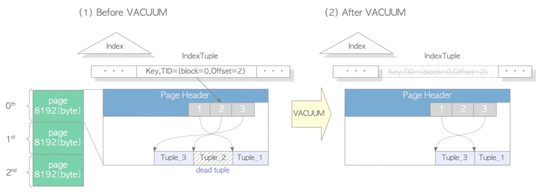 不过此阶段那些 line pointer 并不会被移除,在后面重用,如果 LP 被移除的话,那么相应的索引也需要改变。