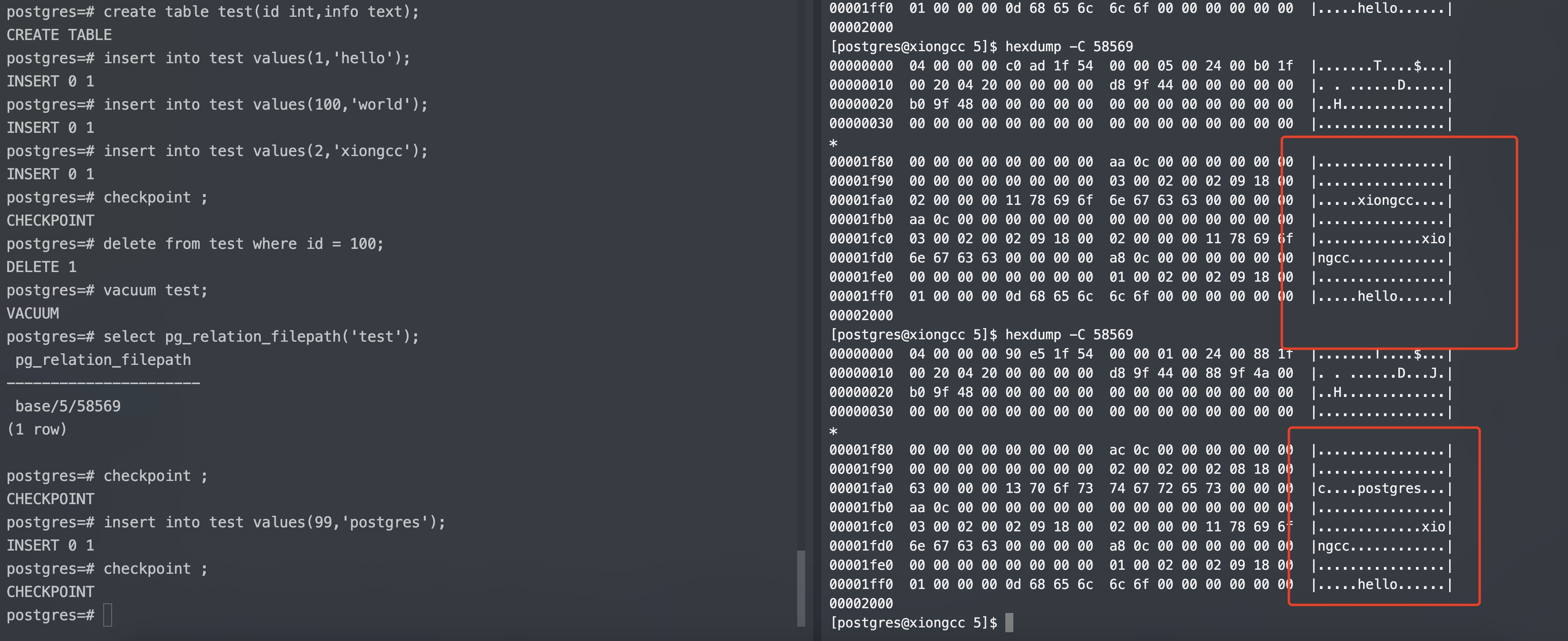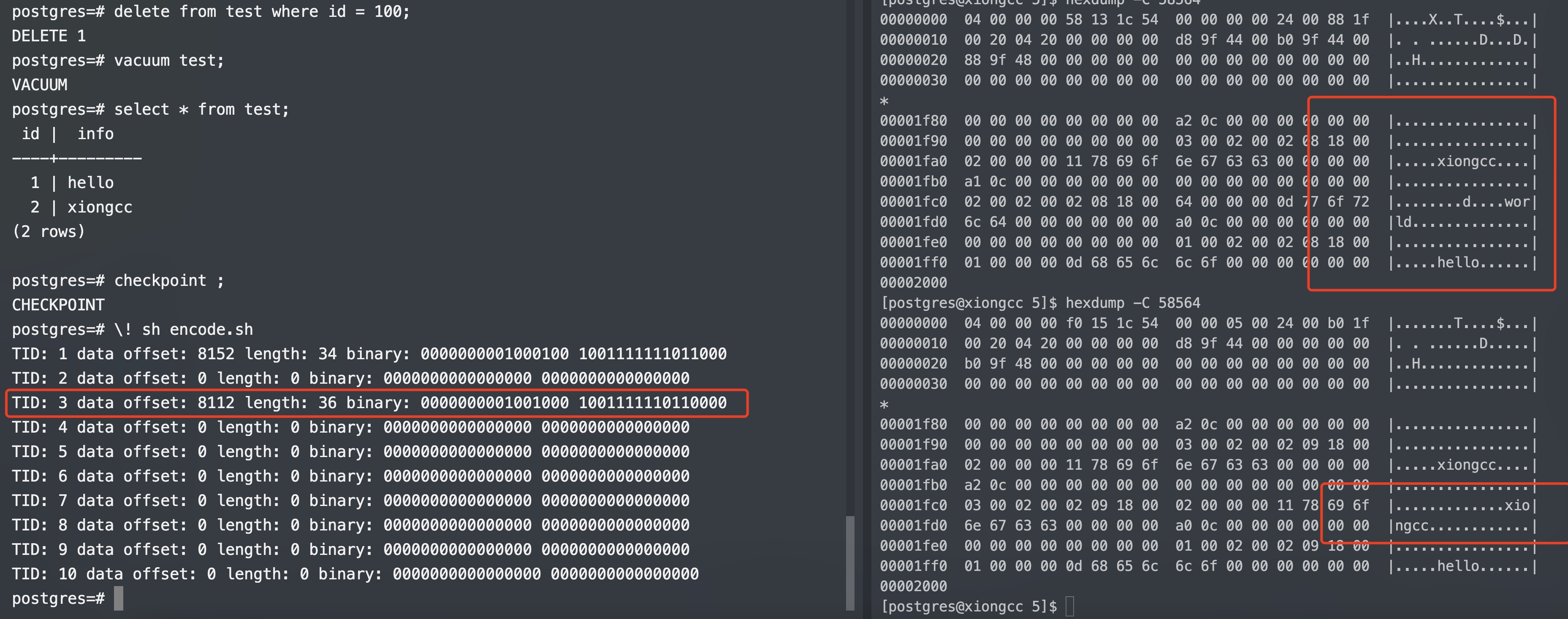 1 2 3 4 5 6 7 8 9 10 11 12 13 14 15 16 17 18 19 20 21 22 23 24 25 26 27 28 29 30 postgres= # insert into test values (100 ,'world' ); INSERT 0 1 postgres= # checkpoint; CHECKPOINT postgres= # \! sh encode.sh TID: 1 data offset : 8152 length: 34 binary : 0000000001000100 1001111111011000 TID: 2 data offset : 8072 length: 34 binary : 0000000001000100 1001111110001000 TID: 3 data offset : 8112 length: 36 binary : 0000000001001000 1001111110110000 TID: 4 data offset : 0 length: 0 binary : 0000000000000000 0000000000000000 TID: 5 data offset : 0 length: 0 binary : 0000000000000000 0000000000000000 TID: 6 data offset : 0 length: 0 binary : 0000000000000000 0000000000000000 TID: 7 data offset : 0 length: 0 binary : 0000000000000000 0000000000000000 TID: 8 data offset : 0 length: 0 binary : 0000000000000000 0000000000000000 TID: 9 data offset : 0 length: 0 binary : 0000000000000000 0000000000000000 TID: 10 data offset : 0 length: 0 binary : 0000000000000000 0000000000000000 postgres= # SELECT lp,lp_off,lp_flags,t_ctid,t_data,infomask(t_infomask,1 )as infomask,infomask(t_infomask,2 )as infomask2 FROM heap_page_items(get_raw_page('test' , 0 )); lp | lp_off | lp_flags | t_ctid | t_data | infomask | infomask2 1 | 8152 | 1 | (0 ,1 ) | \x010000000d68656c6c6f | XMAX_INVALID| XMIN_COMMITTED| HASVARWIDTH | 2 | 8072 | 1 | (0 ,2 ) | \x640000000d776f726c64 | XMAX_INVALID| HASVARWIDTH | 3 | 8112 | 1 | (0 ,3 ) | \x020000001178696f6e676363 | XMAX_INVALID| XMIN_COMMITTED| HASVARWIDTH | (3 rows ) postgres= # select * from test; id | info 1 | hello 100 | world 2 | xiongcc (3 rows )