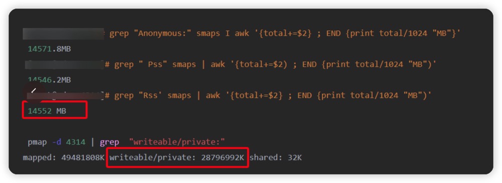 以我这段简短的 C 代码为例,其计算原理也就明白了:将私有的(排除了共享库),可写的(排除只读代码段、包括数据段、栈、堆)相加,得到私有内存。和代码中的原理相同。
