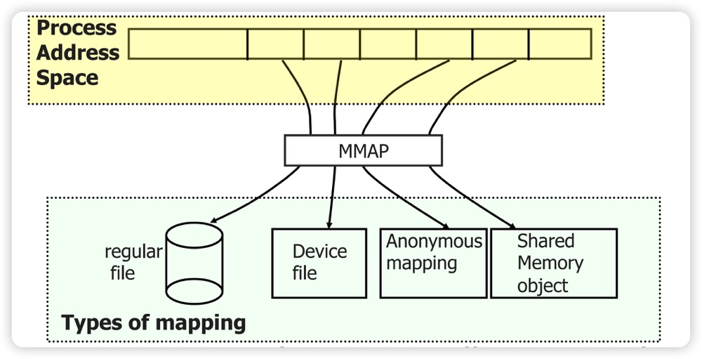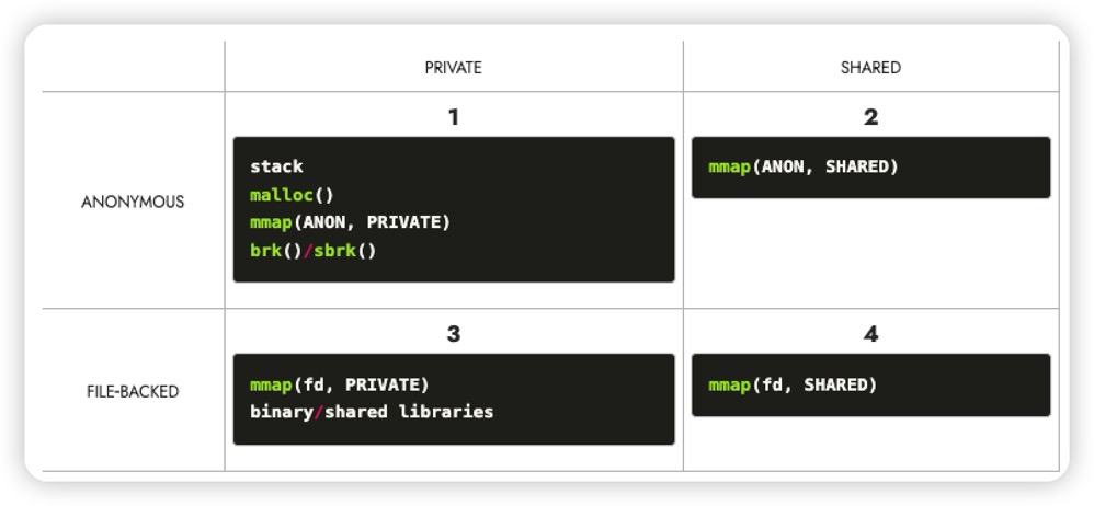 - 私有匿名映射 - 通常用于内存分配,glibc 库里提供的用于动态申请堆内存的 malloc 函数就是对系统调用 sbrk 和 mmap 的封装。