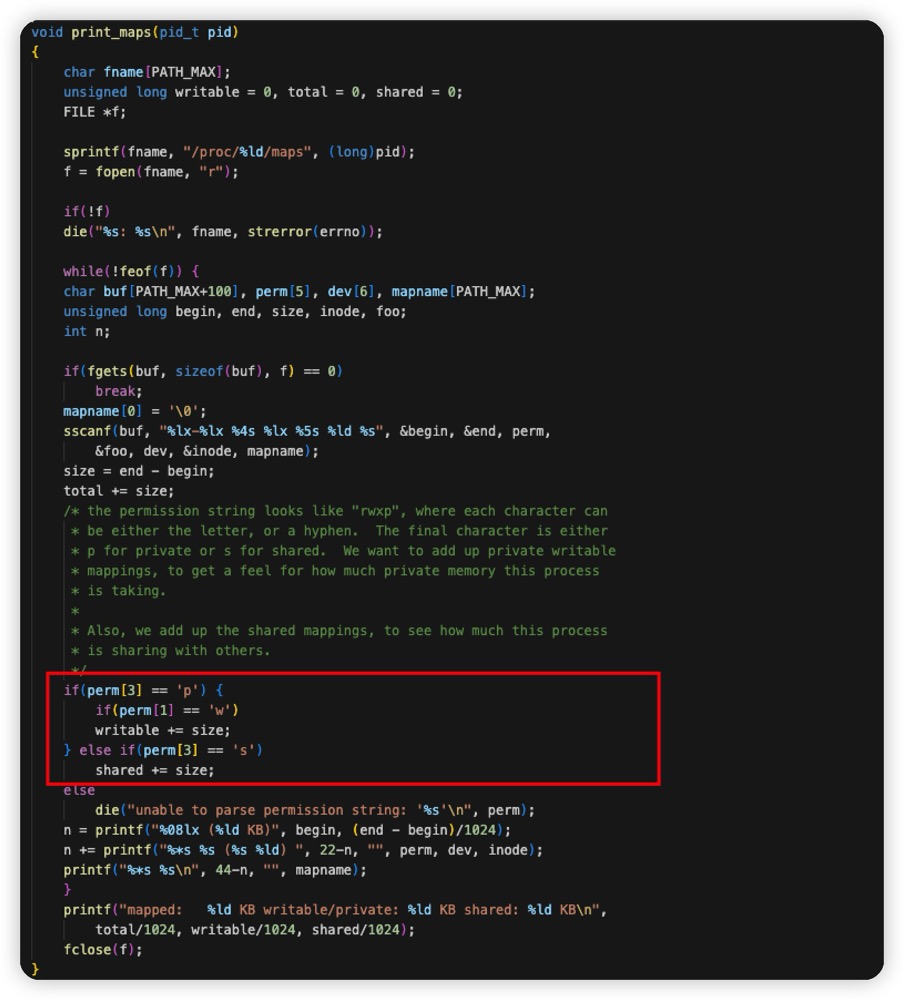 可以看到,pmap 就是读取的 /proc/进程号/maps 文件进行计算的,并且 writable/private 的逻辑也很简单