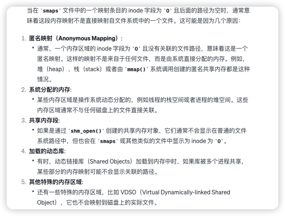 - 被映射到虚拟内存的文件名称。后面带(deleted)的是内存数据,可以被销毁。对有名来说,是映射的文件名。对匿名映射来说,是此段虚拟内存在进程中的角色。[stack]表示在进程中作为栈使用,[heap]表示堆。其余情况则无显示。