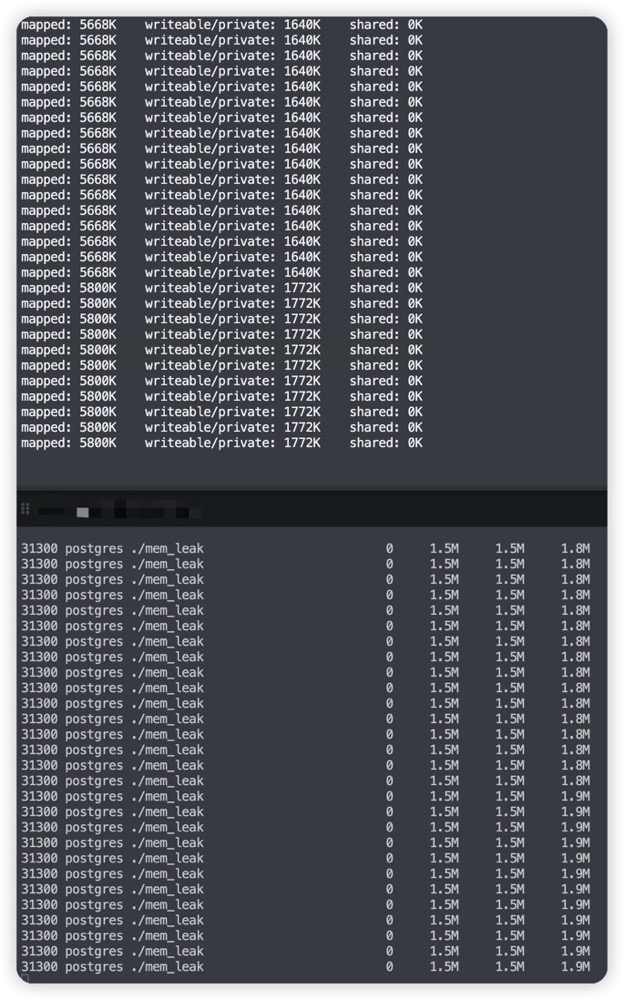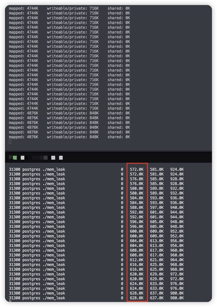 1 | [postgres@xiongcc ~]$ while true; do pmap -d 27647 | tail -1; sleep 2; done |