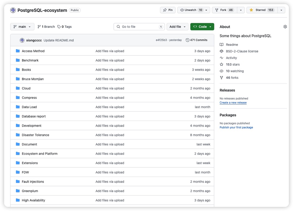 另外我也加大了对 git 的维护,首先是对历史公众号文章进行了分类整理,方便读者阅读与搜索,其次我会将阅读过的优质素材上传至 git 上,目前 ⭐️ 也在稳定增长中,🔗 https://github.com/xiongcccc/PostgreSQL-ecosystem,觉得项目不错的同志就不要吝啬你的 Star 啦。