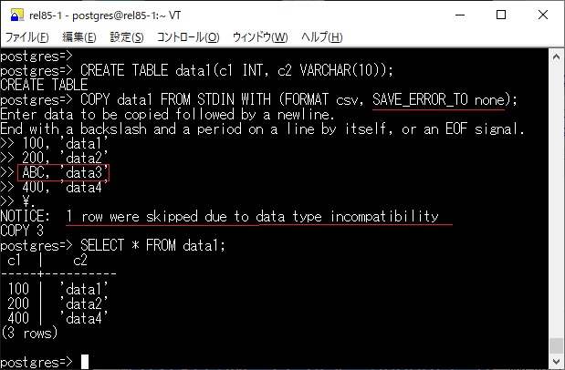 在导入数据的时候可以忽略错误继续导入,目前会忽略错误的记录,然后继续导入,同时在 pg_stat_progress_copy 中添加了 tuples_skipped 字段