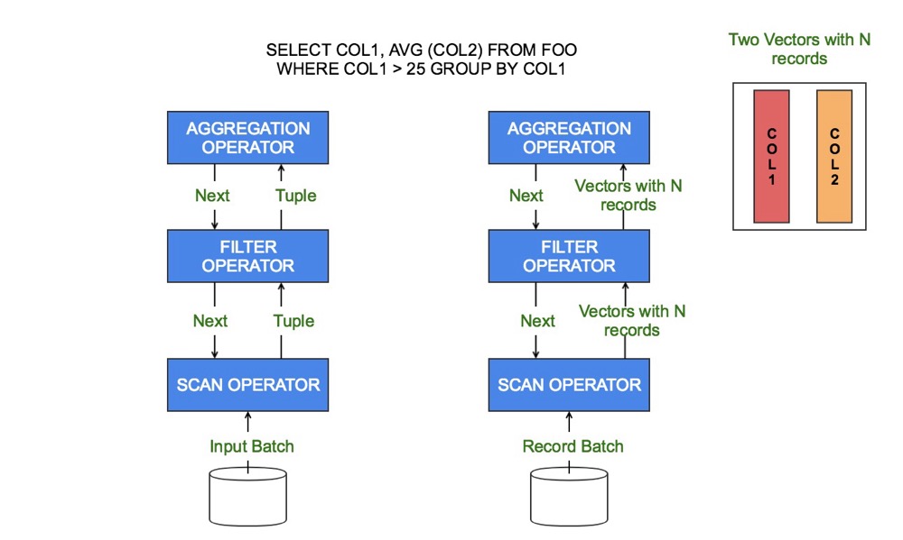 随着硬件的不断革新,硬件的能力早已不同往日,火山模型的弊端逐渐显露。性能表现差强人意。当需要处理的数据量增大时,具有显著的缺陷。搞懂了火山模型的缺点之后,现在来讲为什么向量化模型能够解决这个问题。鉴于火山模型每次处理一行一行数据,next 调用代价又比较高,那么我们可以很自然地想到,**有没有办法一次处理一批数据呢?**这正是向量化模型的重要区别,每个 operator 仍然需要实现 next() 函数,但是每次调用 next() 函数返回的是一批元组,而不是一个元组,所以向量化模型也可称为批处理模型。