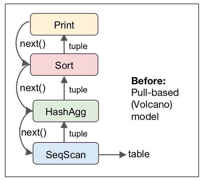 可以看到,查询树每次调用 next() 接口从下层节点拉取一条元组,自顶向下嵌套调用 next() ,数据则自底向上地被拉取处理,Joins、Order By 等操作经常会阻塞。
