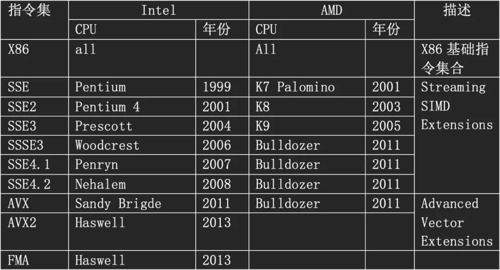 经过多年的发展,支持 SIMD 的指令集有很多。各种 CPU 架构都提供各自的 SIMD 指令集,要判断当前设备 CPU 的支持能力,在命令行通过 cat /proc/cpuinfo 在输出中查看 flags 一项,看是否包含 avx、avx2 等。SIMD 指令需要硬件支持 MMX 系列,SSE (Streaming SIMD Extensions) 系列、AVX (Advanced Vector Extensions) 系列扩展指令集。目前大部分 CPU 都支持 AVX2,只有最新的 CPU 才支持 AVX512。