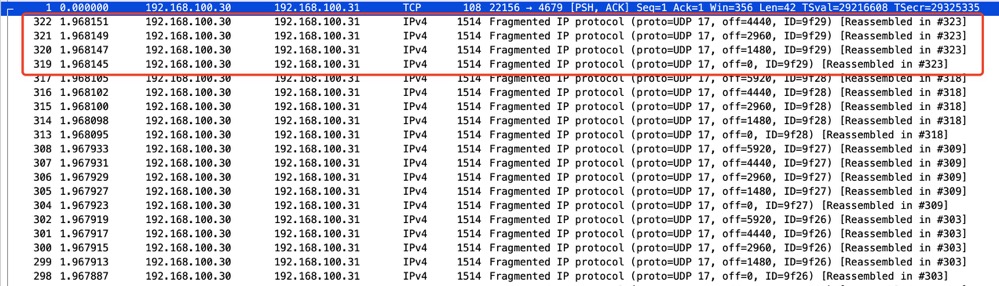 这些抓取的分片数据包表明有较大的 UDP 数据包通过网络传输,并由于超过了 MTU,被 IP 层分片传输 (Fragmented IP protocal)。offset 表示这是 IP 分片,不同的分片具有不同的偏移量,接收端根据此属性的顺序重组切片。而我们看到的 1514 字节则是 MTU + 以太网帧头 (通常是 14 字节) 的大小。