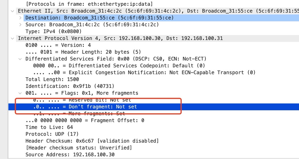 之前抓取的报文中也可以看到,Don’t fragment 并没有设置,即允许分片。