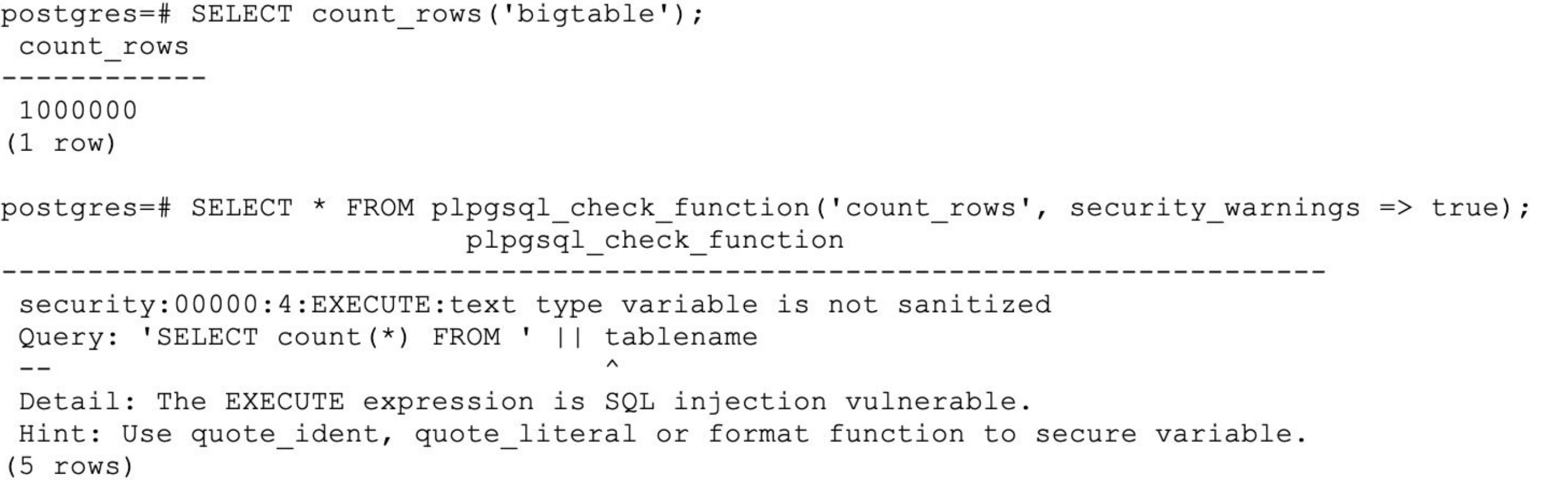 基于此,plpgsql_check 的作用便出来了,预检查,以发现潜在的问题,还可以分析性能,检查 SQL 注入等等。