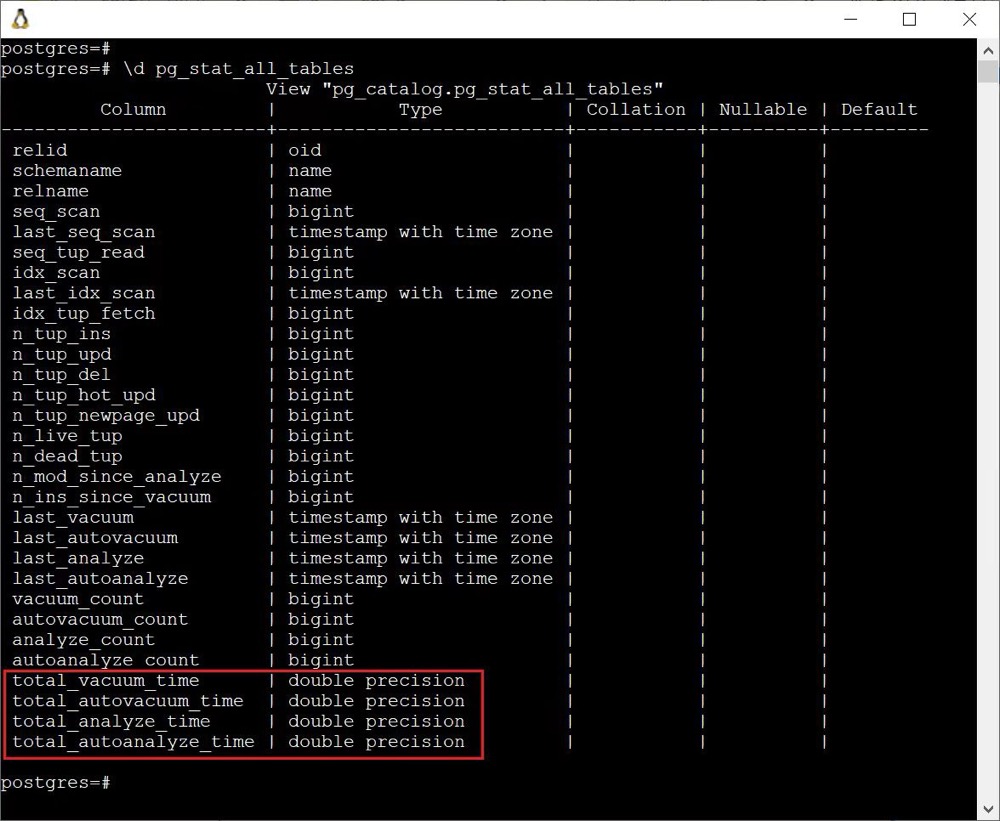 在 pg_stat_all_tables 中新增了 (auto) vacuum 和 (auto) analyze 的相关耗时指标,这对于我们诊断 VACUUM 问题的时候无疑大有裨益。