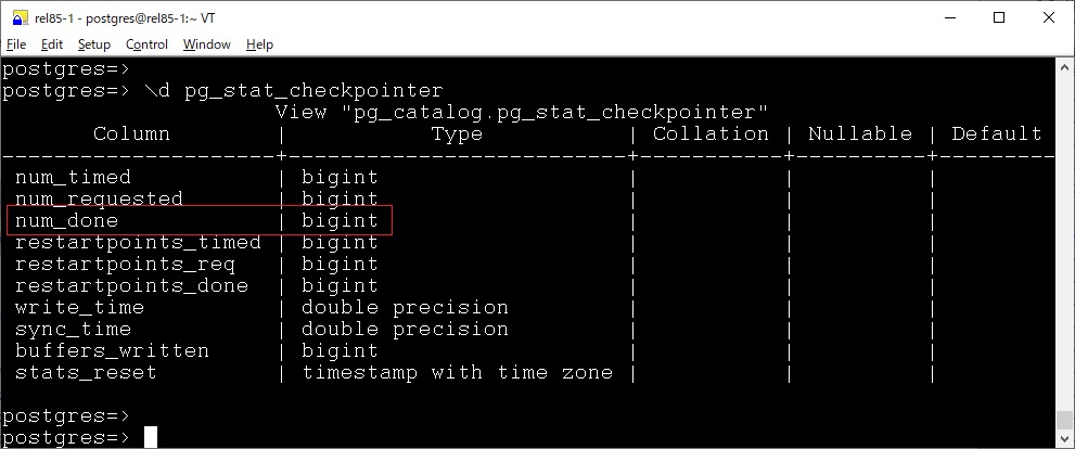 在 pg_stat_checkpointer 视图中,新增了 num_done 字段,pg_stat_checkpointer 中现有的 num_timed 和 num_requested 计数器用于跟踪已完成和跳过的检查点,但无法仅计数已完成的检查点。