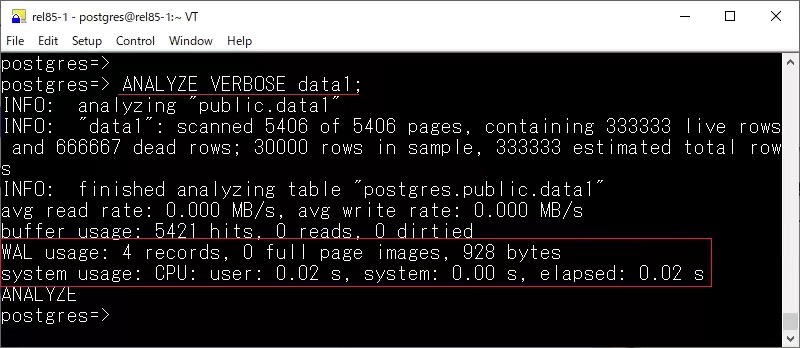 对于 ANALYZE,在 18 版本中可以看到资源消耗情况以及 WAL 的使用情况