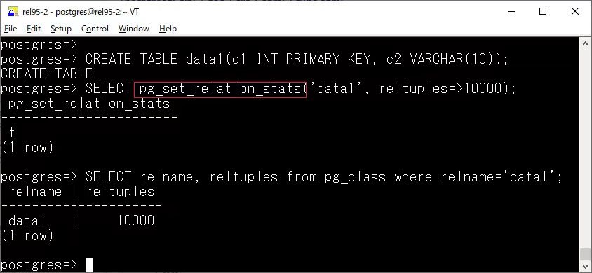 1 | postgres=# select * from pg_set_relation_stats('t'::regclass, 1, 1000000 ); |
