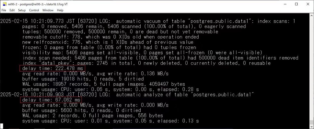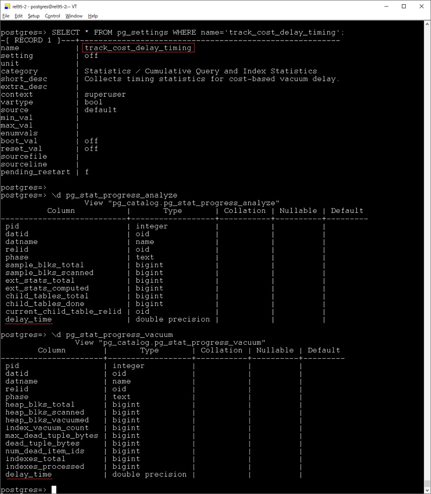 另外新增了一个 track_cost_delay_timing 参数,启用后,将记录基于成本的清理延迟统计信息的时间,用于清理和分析操作,并将在 pg_stat_progress_analyze 和 pg_stat_progress_vacuum 中的 delay_time 列中可见,不过在计时较差的平台上,也可能会造成较大的性能影响,因此默认是关闭的。