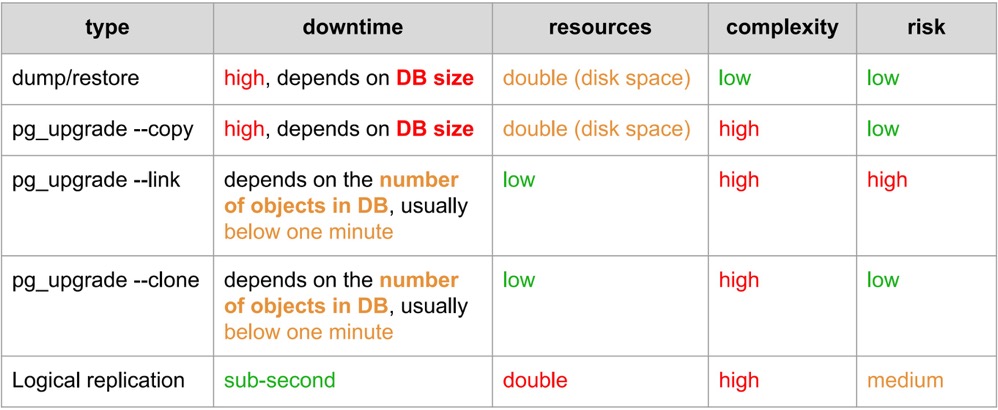 首先,大版本升级并不仅限于 pg_upgrade 和逻辑导入导出,还有逻辑复制,三者各有优劣,此处表过不提。