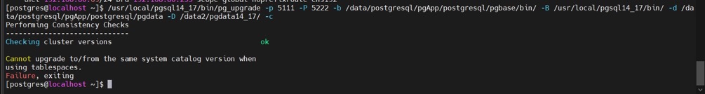 回到 pg_upgrade,印象中是可以正确处理表空间的,包括在官方文档中也并没有提及有相关限制。于是要了一个详细的错误截图: