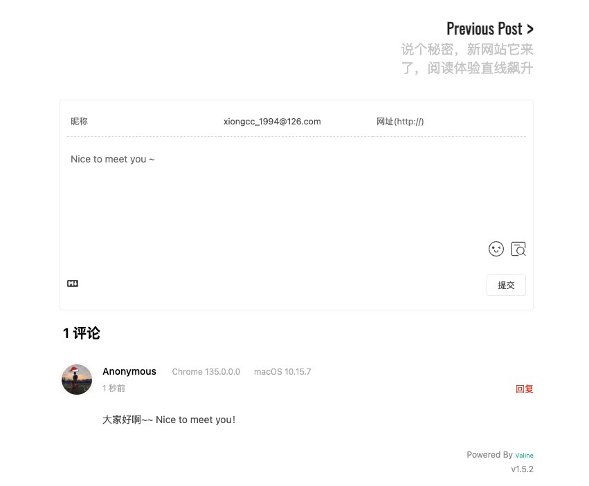 评论系统是基于 Valine 的,要像我这样显示头像的话,去 gravatar 官网配置一下即可,否则就是一张残缺的头像。