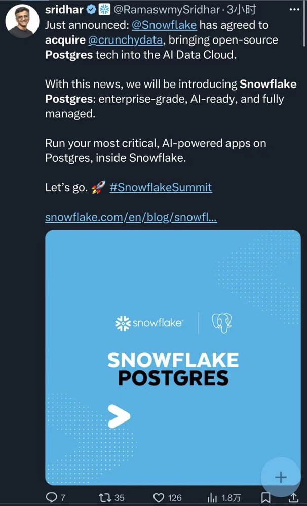 前些天写了一篇《PostgreSQL + 组播,有希望成为下一个被收购的 neon 吗?》,前阵子 Databricks 官宣收购开源数据库引擎初创公司 Neon 的消息沸沸扬扬,Neon 专注于给 AI Agent 背后“自动创建、管理数据库”的能力:秒级启动实例、弹性伸缩、即时分支/回滚,这和 Databricks 助力企业构建“自主智能体” 的战略需求不谋而合,这不 Databricks 的老对手 Snowflake 立马跟进,大手一挥,宣布收购 Cruncydata,将企业级 Postgres 托管能力并入 Snowflake Data Cloud,再次印证了 PostgreSQL 无穷潜力。