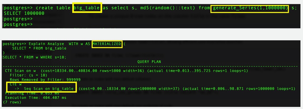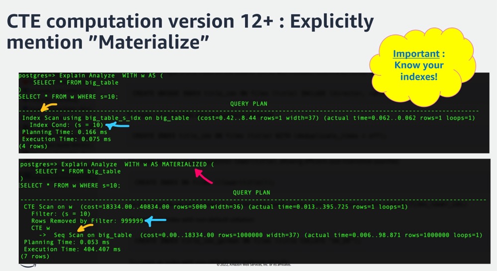 可以看到,在 12 以后,就可以走索引扫描了,将 CTE “展开”了,大幅提升查询效率,不用再先全表扫一遍 big_table。不过值得注意的是,物化有其好处,也有其坏处