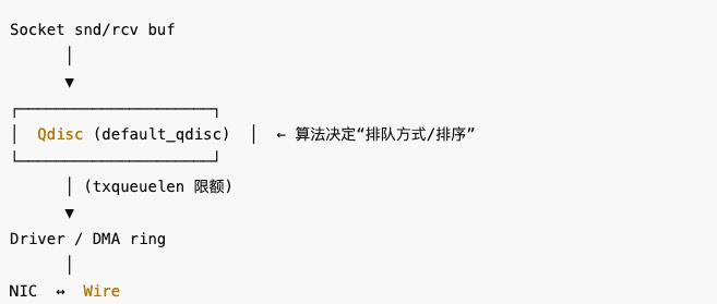Egress Qdisc,Output 队列长度 + 算法;与 Bufferbloat、流控息息相关,关键参数:txqueuelen + net.core.default_qdisc,txqueuelen 用于增大网卡传送队列的长度,表示最大缓存包的数量,超过这个数量的包会被丢弃,Socket → Qdisc 由 net.core.default_qdisc 控制,Qdisc → Driver 是设备发送队列 (txqueuelen),设备层的软件发送队列长度 (包数)。当 Qdisc 把包送到驱动,如驱动/硬件忙,包会在此排队。