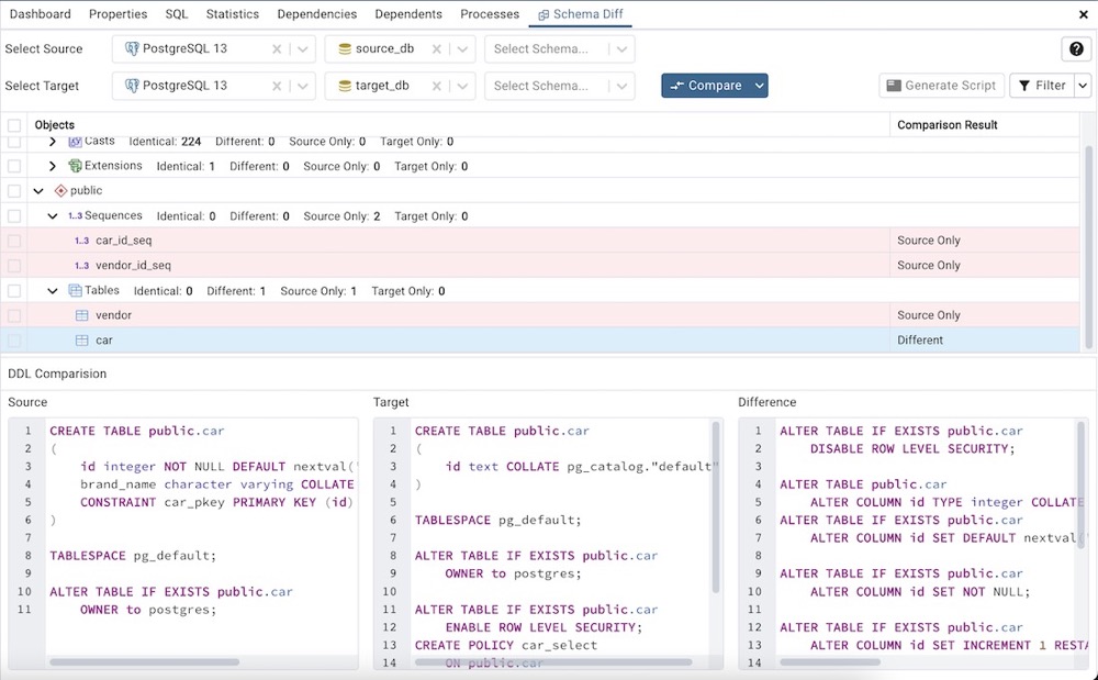 - schema diff、ER 图:外部工具,比如 dbeaver、pgModeler