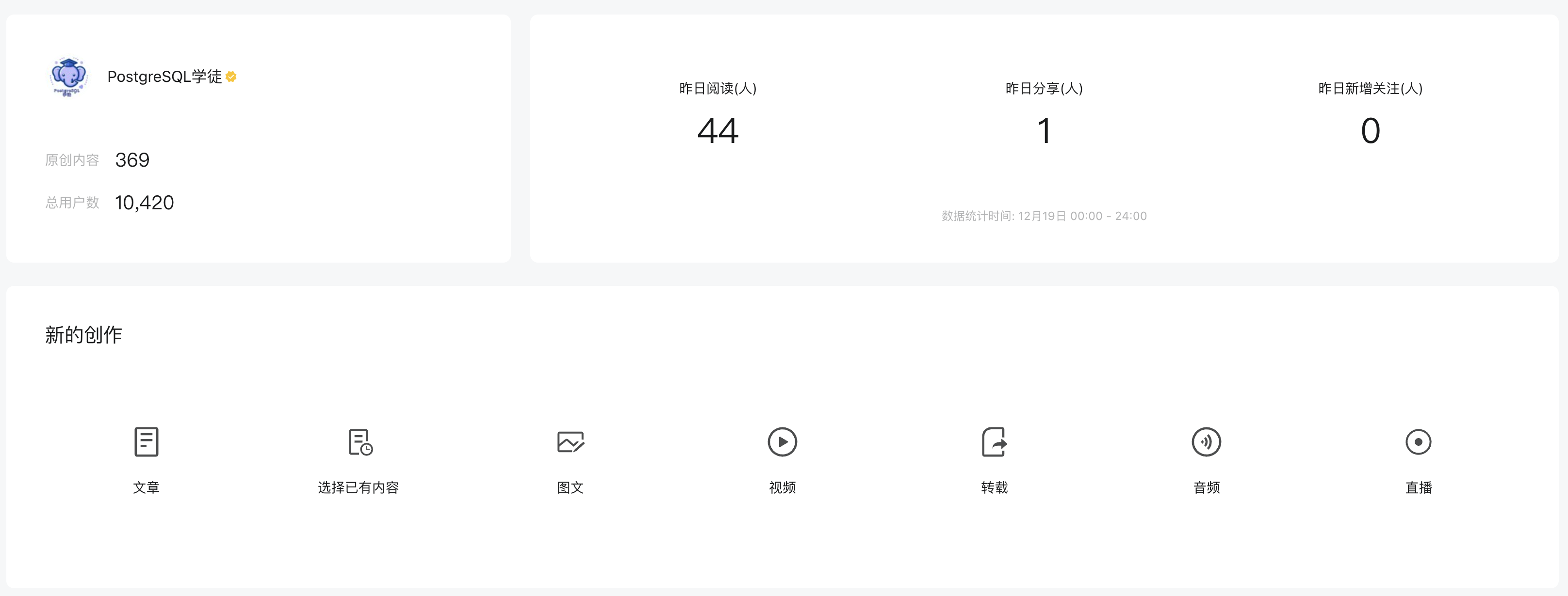 说回技能。今年因为各种客观因素,我在“纯 PG 深挖”上投入没那么多,但依旧保持输出节奏:尽量做到每周至少一篇技术干货。公众号粉丝破万也有一段时间了,算是完成了年中给自己定的目标。熟悉我的读者都知道,「PostgreSQL 学徒」一直是偏硬核的路线:不写软文、不灌水、不接广告、不玩标题党。技术受众就那么一小撮,做到 1W,我自己觉得还挺不错。明年继续坚持,慢慢把这条路走长。