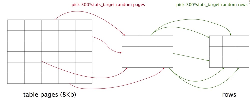 默认情况下,采集的行数会有个限制,最小100行,最大 300 * default_statistics_target ,不足100行的话,则获取全部数据,随机获取数据块,随机获取数据,假如数据量足够的话,默认随机选择 300 * default_statistics_target 个数据块,然后从中随机选择 300 * 300 * default_statistics_target 行数据。